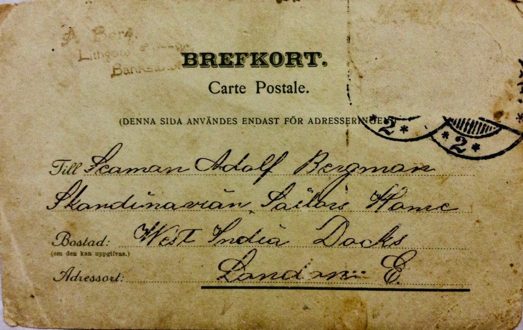 Let me start by explaining the Header at the top of this site. Adolf’s brother, Axel, sent Adolf a postcard addressed to the Scandinavian Sailor’s Home, West India Docks, London E. The postcard is actually called: Guess Their Secret. If anyone can find a date on the card, please let us all know. Even with my glasses on, I cant see what the faint writing is in the place where the stamp should be.